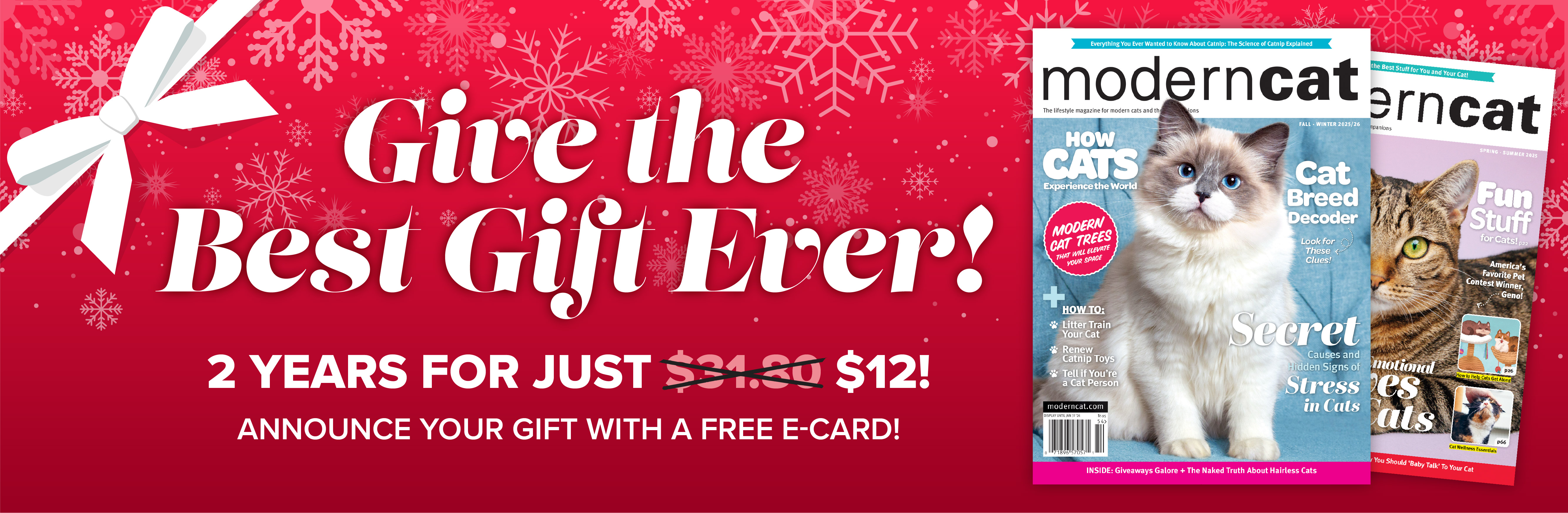 Automatic Renewal: Modern Cat magazine is published two times per year. Continuous Service Program: I understand that unless I tell you otherwise, I will receive uninterrupted service and access; my subscription(s) will be automatically renewed at the end of each subscription term, at the rate(s) then in effect. I authorize you to fulfill my subscription(s) and charge the credit/debit card if provided or send me a bill if not. I won’t be bothered with any renewal notices, instead, I will receive a clearly marked reminder notice with the then-current rate(s) about 30 days prior to charging my credit/debit card or receiving a bill. I may opt-out of the automatic renewal at any time by contacting customer service referenced below and receive a refund for all undelivered issues. To reach the Customer Service Dept, please email subscriptions@moderncat.com or call 1-800-417-6289. Subscribers: If the Post Office alerts us that your magazine is undeliverable, we have no further obligation unless we receive a corrected address within one year. All orders subject to approval. Standard Canada and US pricing: 2yrs/$18, 3yrs/$25 Standard pricing outside of North America: 2yrs/$45, 3yrs/$85. Prices are subject to applicable sales tax. Frequency of all magazines subject to change without notice. Double issues may be published, which count as 2 issues. We reserve the right to substitute gifts of equal or greater value. Applicable sales tax will be added. Modern Cat magazine’s cover price is $7.95 and publishes semi-annually, except when future combined issues are published that count as two issues as indicated on the issue’s cover. Refund Policy To cancel your subscription, please email subscriptions@moderndogmagazine.com or call 1.800.417.6289. A refund will be issued for all the remaining copies that haven’t been mailed at the time of the cancellation.