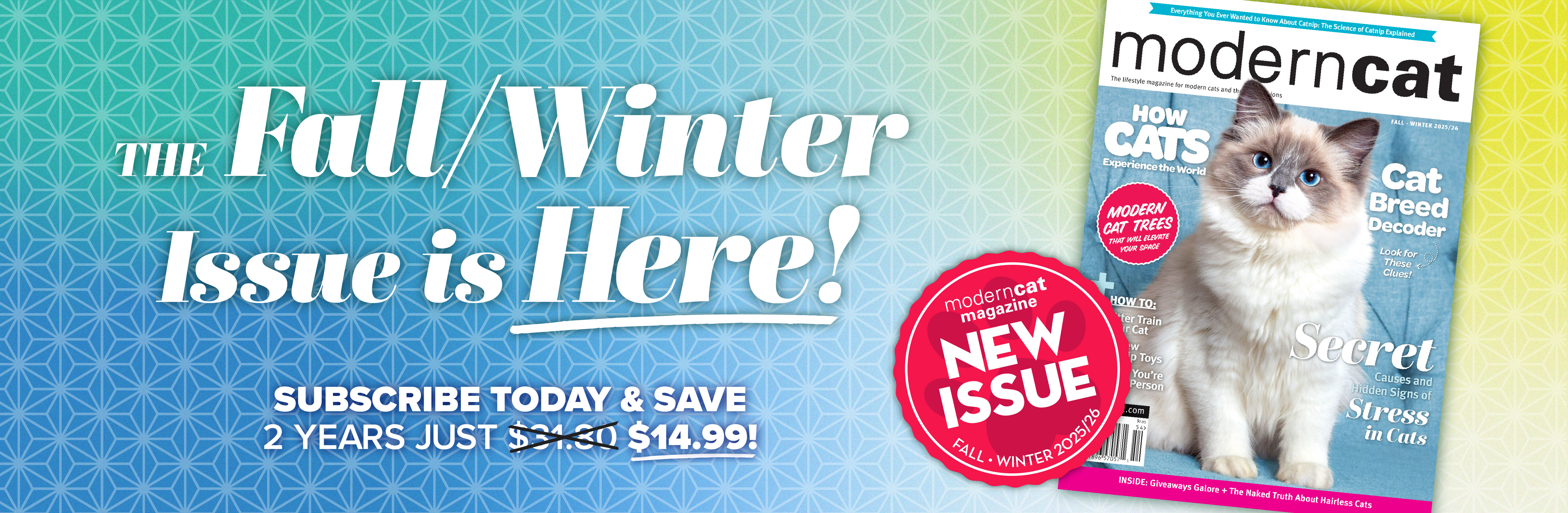 Automatic Renewal: Modern Cat magazine is published two times per year. Continuous Service Program: I understand that unless I tell you otherwise, I will receive uninterrupted service and access; my subscription(s) will be automatically renewed at the end of each subscription term, at the rate(s) then in effect. I authorize you to fulfill my subscription(s) and charge the credit/debit card if provided or send me a bill if not. I won’t be bothered with any renewal notices, instead, I will receive a clearly marked reminder notice with the then-current rate(s) about 30 days prior to charging my credit/debit card or receiving a bill. I may opt-out of the automatic renewal at any time by contacting customer service referenced below and receive a refund for all undelivered issues. To reach the Customer Service Dept, please email subscriptions@moderncat.com or call 1-800-417-6289. Subscribers: If the Post Office alerts us that your magazine is undeliverable, we have no further obligation unless we receive a corrected address within one year. All orders subject to approval. Standard Canada and US pricing: 2yrs/$18, 3yrs/$25 Standard pricing outside of North America: 2yrs/$45, 3yrs/$85. Prices are subject to applicable sales tax. Frequency of all magazines subject to change without notice. Double issues may be published, which count as 2 issues. We reserve the right to substitute gifts of equal or greater value. Applicable sales tax will be added. Modern Cat magazine’s cover price is $7.95 and publishes semi-annually, except when future combined issues are published that count as two issues as indicated on the issue’s cover. Refund Policy To cancel your subscription, please email subscriptions@moderndogmagazine.com or call 1.800.417.6289. A refund will be issued for all the remaining copies that haven’t been mailed at the time of the cancellation.