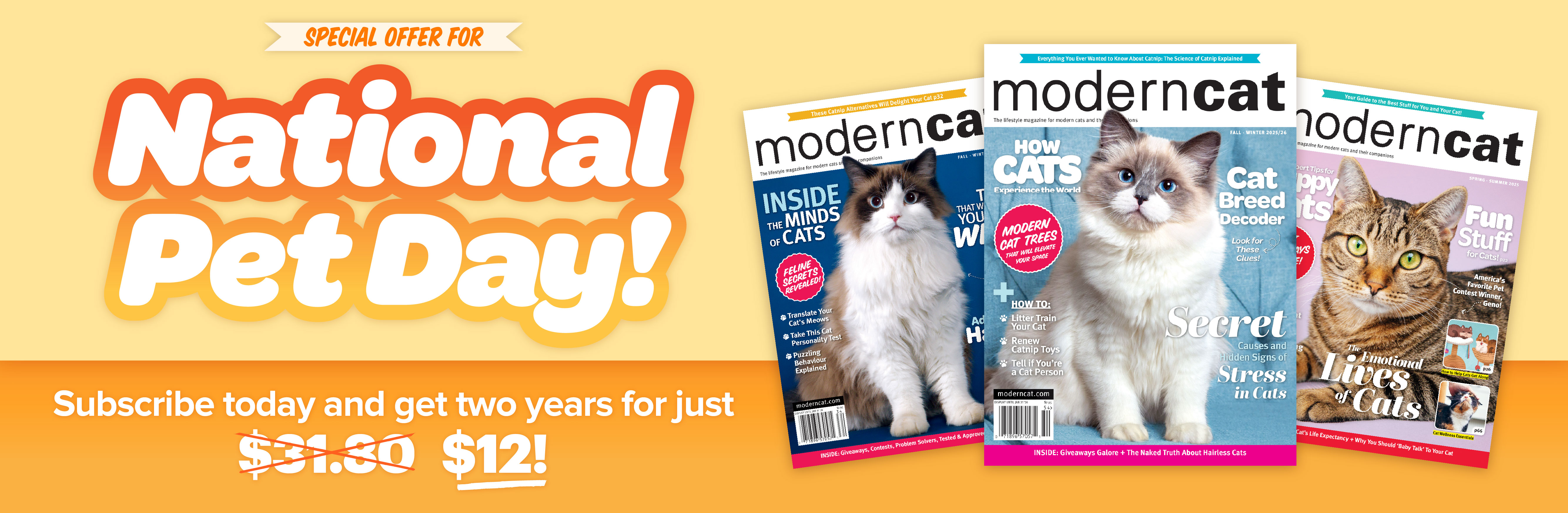 Automatic Renewal: Modern Cat magazine is published two times per year. Continuous Service Program: I understand that unless I tell you otherwise, I will receive uninterrupted service and access; my subscription(s) will be automatically renewed at the end of each subscription term, at the rate(s) then in effect. I authorize you to fulfill my subscription(s) and charge the credit/debit card if provided or send me a bill if not. I won’t be bothered with any renewal notices, instead, I will receive a clearly marked reminder notice with the then-current rate(s) about 30 days prior to charging my credit/debit card or receiving a bill. I may opt-out of the automatic renewal at any time by contacting customer service referenced below and receive a refund for all undelivered issues. To reach the Customer Service Dept, please email subscriptions@moderncat.com or call 1-800-417-6289. Subscribers: If the Post Office alerts us that your magazine is undeliverable, we have no further obligation unless we receive a corrected address within one year. All orders subject to approval. Standard Canada and US pricing: 2yrs/$18, 3yrs/$25 Standard pricing outside of North America: 2yrs/$45, 3yrs/$85. Prices are subject to applicable sales tax. Frequency of all magazines subject to change without notice. Double issues may be published, which count as 2 issues. We reserve the right to substitute gifts of equal or greater value. Applicable sales tax will be added. Modern Cat magazine’s cover price is $7.95 and publishes semi-annually, except when future combined issues are published that count as two issues as indicated on the issue’s cover. Refund Policy To cancel your subscription, please email subscriptions@moderndogmagazine.com or call 1.800.417.6289. A refund will be issued for all the remaining copies that haven’t been mailed at the time of the cancellation.